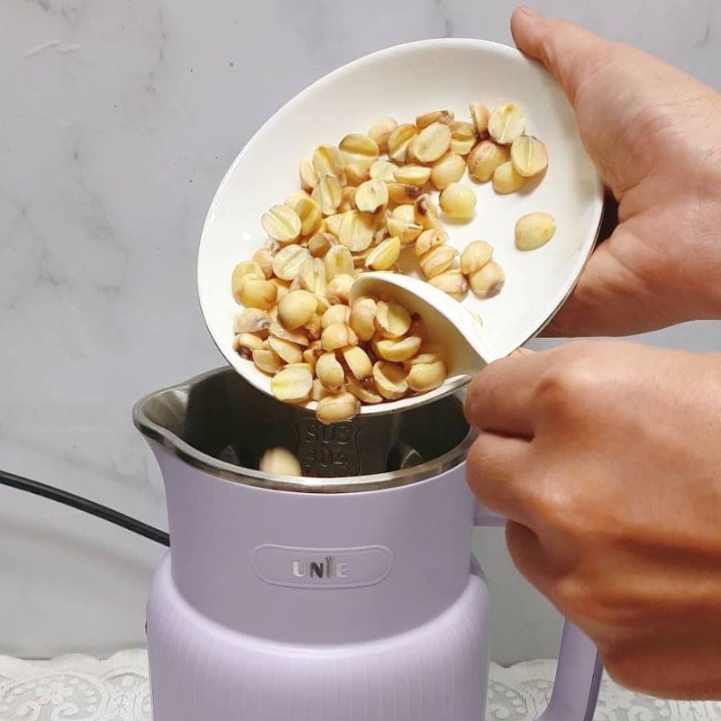 Nhấn nút khởi động, chọn chế độ "Nut Milk" (Sữa hạt) hoặc "Grain Milk" (Sữa ngũ cốc) trên máy Bear - đây là các chế độ lý tưởng để làm sữa hạt sen, với thời gian khoảng 25 - 35 phút. Máy sẽ tự động xay hạt sen bằng lưỡi dao tốc độ cao (30.000 vòng/phút), sau đó nấu ở nhiệt độ 100°C, tạo ra sữa mịn màng mà không cần bạn can thiệp. Nếu máy không có chế độ này, bạn có thể chọn "Cook" (Nấu) trong 25 phút, rồi xay thêm 1 - 2 phút để sữa mịn hơn. Trong lúc máy hoạt động, bạn có thể làm việc khác - không cần đứng canh như nấu bếp truyền thống. Khi máy báo hoàn thành bằng tiếng "bíp", sữa đã sẵn sàng.