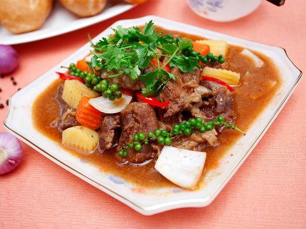 Mẹo: Chọn thịt bò có gân nhẹ để món hầm mềm, không khô. Tiêu xanh tươi giúp món ăn thơm đặc trưng. Có thể thêm ít rượu trắng khi ướp để khử mùi bò.