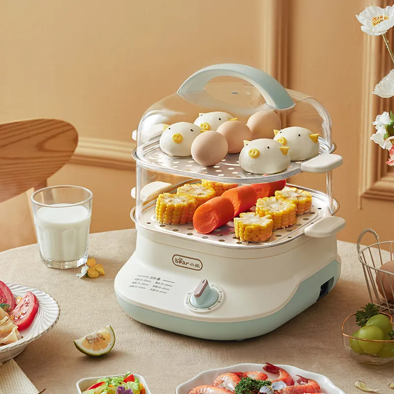 Nồi hấp Bear: Bear được thiết kế với sự linh hoạt, thường có 2 - 3 tầng khay để nấu nhiều món cùng lúc, tích hợp hẹn giờ tiện lợi (thường tối đa 60 phút), và tính năng tự ngắt khi cạn nước để bảo vệ máy. Một số mẫu còn có chế độ chống trào nước, giúp giữ vệ sinh khu vực bếp trong quá trình nấu. Bảng điều khiển của Bear thường đơn giản với nút vặn cơ học hoặc màn hình hiển thị, dễ thao tác cho cả người lớn tuổi hay người mới bắt đầu sử dụng thiết bị điện.
