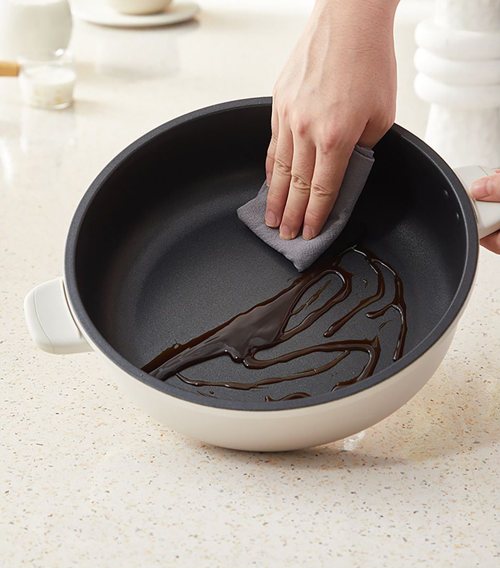 Rửa kỹ lòng nồi, nắp kính, chảo nướng để loại bỏ dầu mỡ, cặn bẩn.