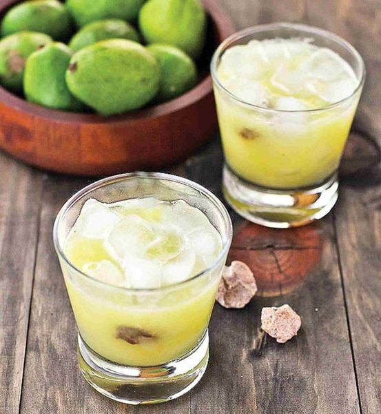 Cách làm: Gọt vỏ cóc, cắt nhỏ cùng ổi, ép lấy nước hoặc xay với nước lọc rồi lọc. Trộn nước ép với mật ong, khuấy đều, thêm đá. Ly nước ép có màu xanh nhạt, vị chua ngọt xen chút giòn tan của ổi, rất hợp để giải nhiệt.
