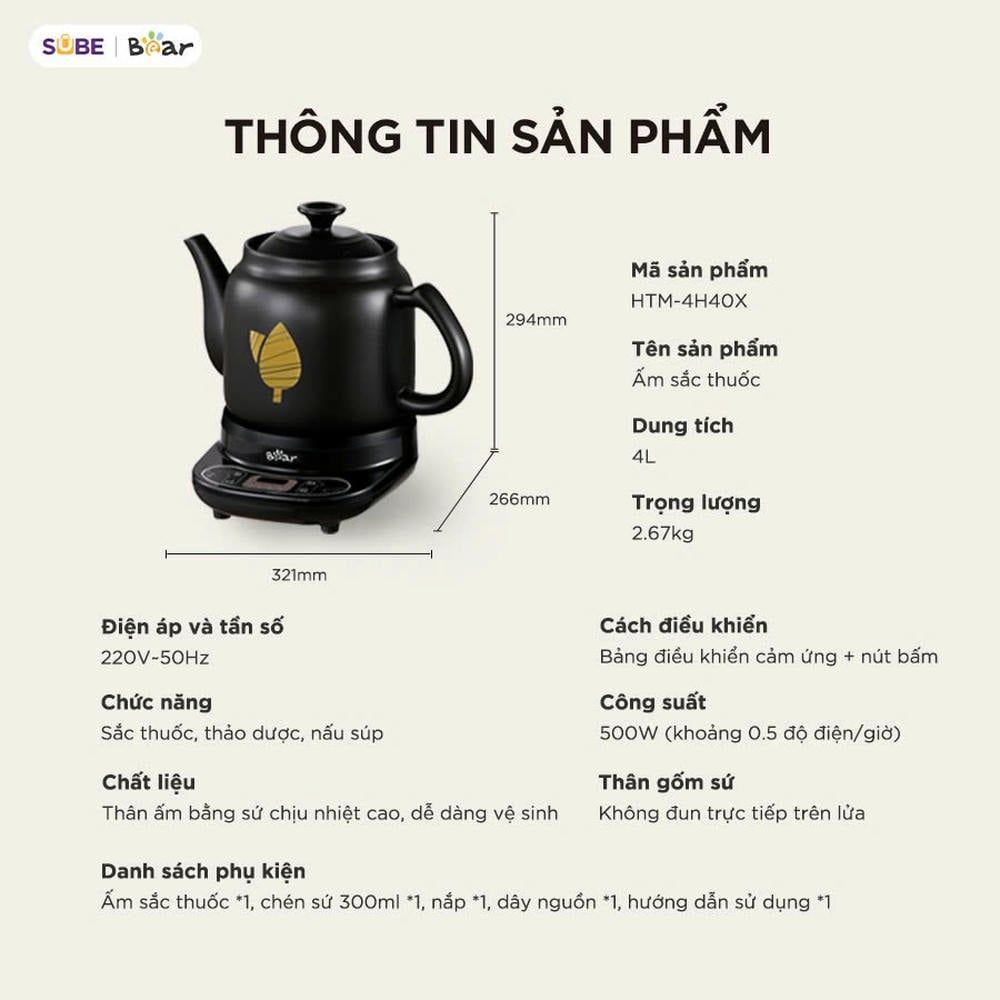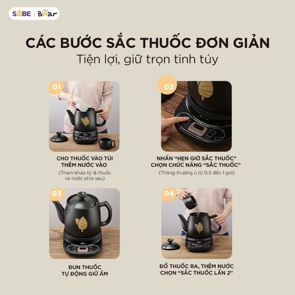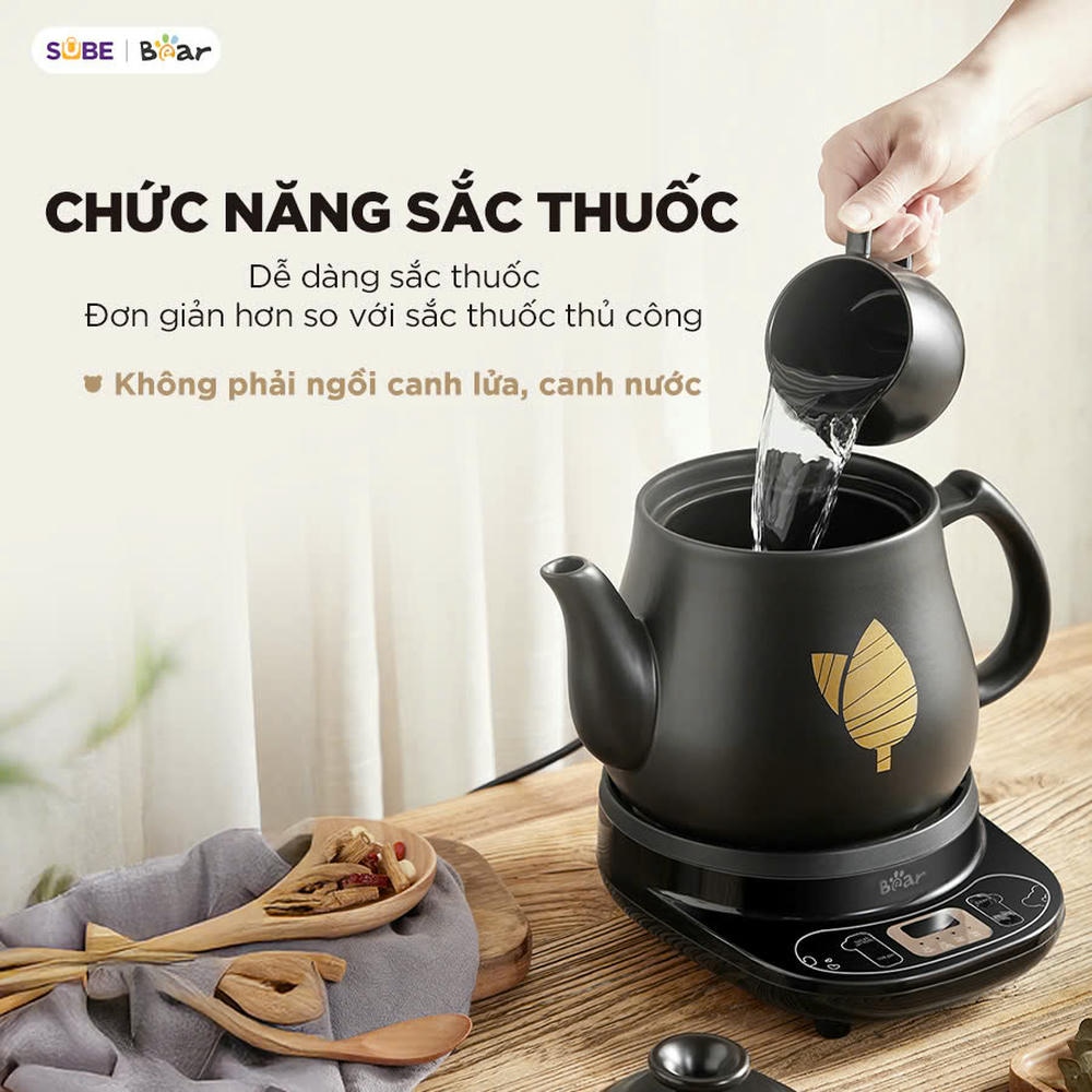 Việc sắc thuốc thủ công bằng bếp ga hay bếp than không chỉ mất thời gian mà còn tiềm ẩn rủi ro canh sai lửa, trào thuốc, hoặc đun quá lâu làm giảm dược tính. Với ấm sắc thuốc tự động Bear HTM-4H40X, quá trình sắc thuốc giờ đây trở nên dễ dàng, an toàn và chính xác hơn bao giờ hết - phù hợp cho mọi gia đình có người sử dụng Đông y, cần sắc thuốc thường xuyên mà không mất công theo dõi.