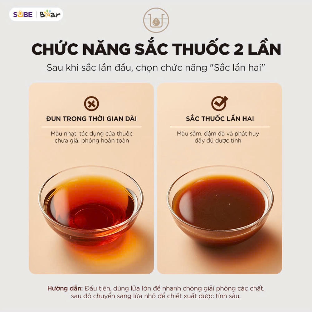 Bear HTM-4H40X ứng dụng thuật toán gia nhiệt 2 giai đoạn: đun nhanh ở giai đoạn đầu để trích ly dược chất, sau đó giảm nhiệt từ từ nhằm cô đặc nước thuốc mà không làm biến đổi hoạt chất. Nhờ đó, thuốc được sắc đúng chuẩn như thầy thuốc hướng dẫn, đảm bảo đúng liều, đúng chất lượng.