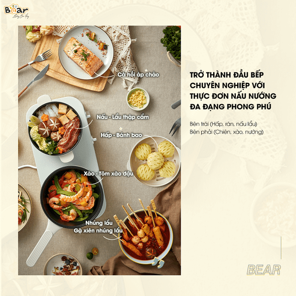 Bộ bếp Bear SB-BD02N cho phép bạn thực hiện nhiều phương pháp nấu ăn khác nhau như hấp, luộc, chiên, rán, nấu lẩu. Với sản phẩm này, bạn không cần phải sử dụng quá nhiều thiết bị nhà bếp, từ đó tiết kiệm không gian và chi phí.