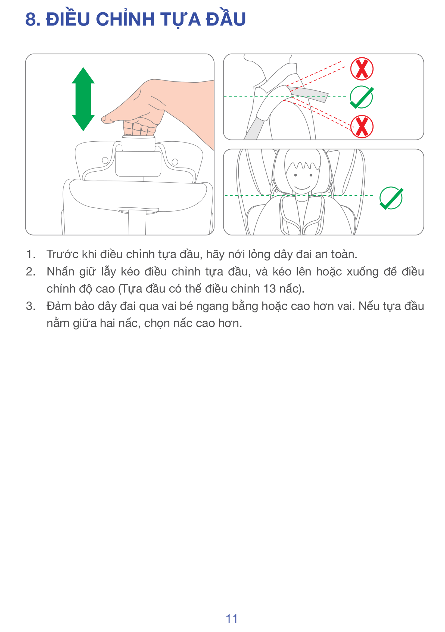 | Điều chỉnh | 11 mức tựa đầu, 2 chế độ ngả, đai 5 điểm |