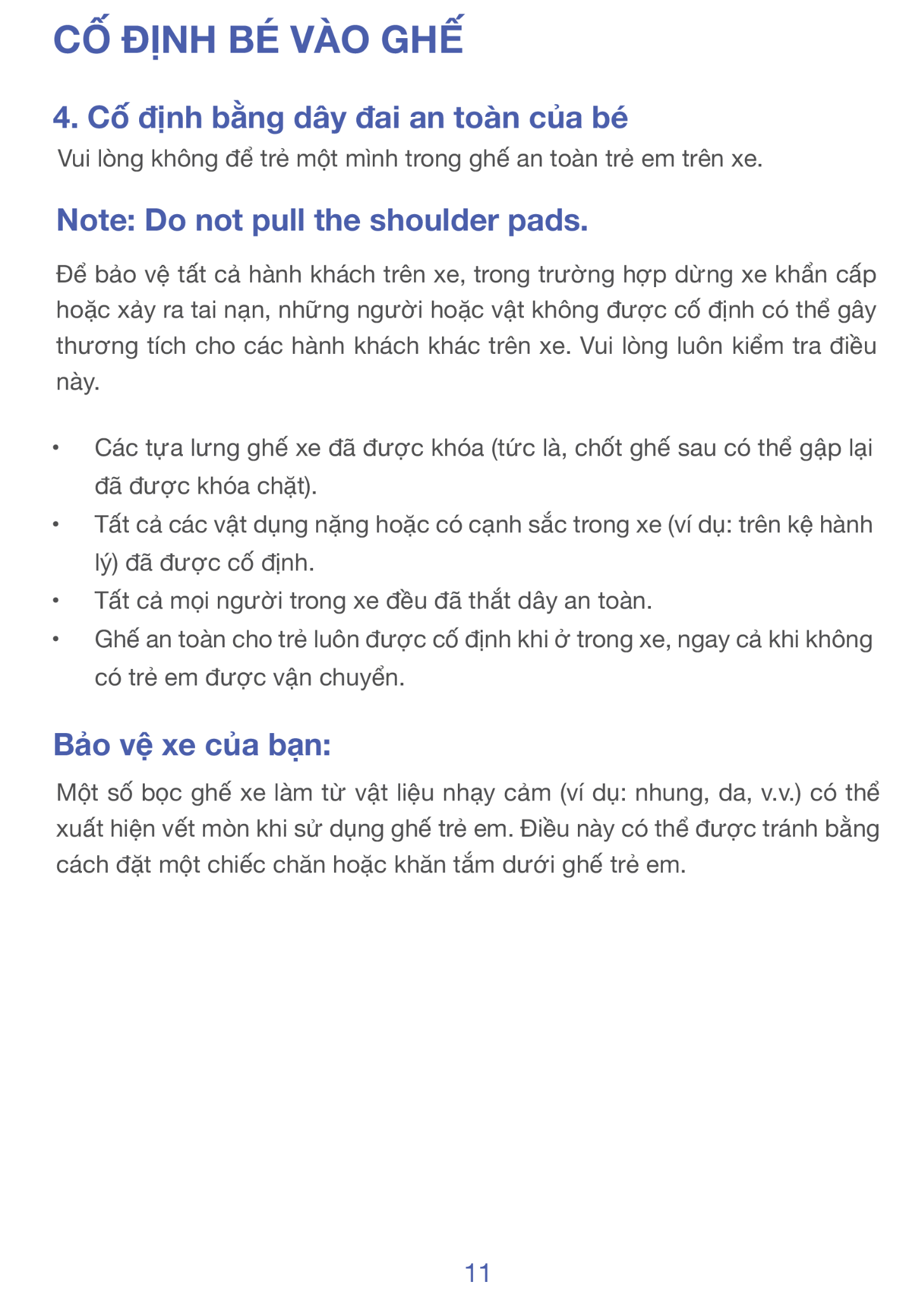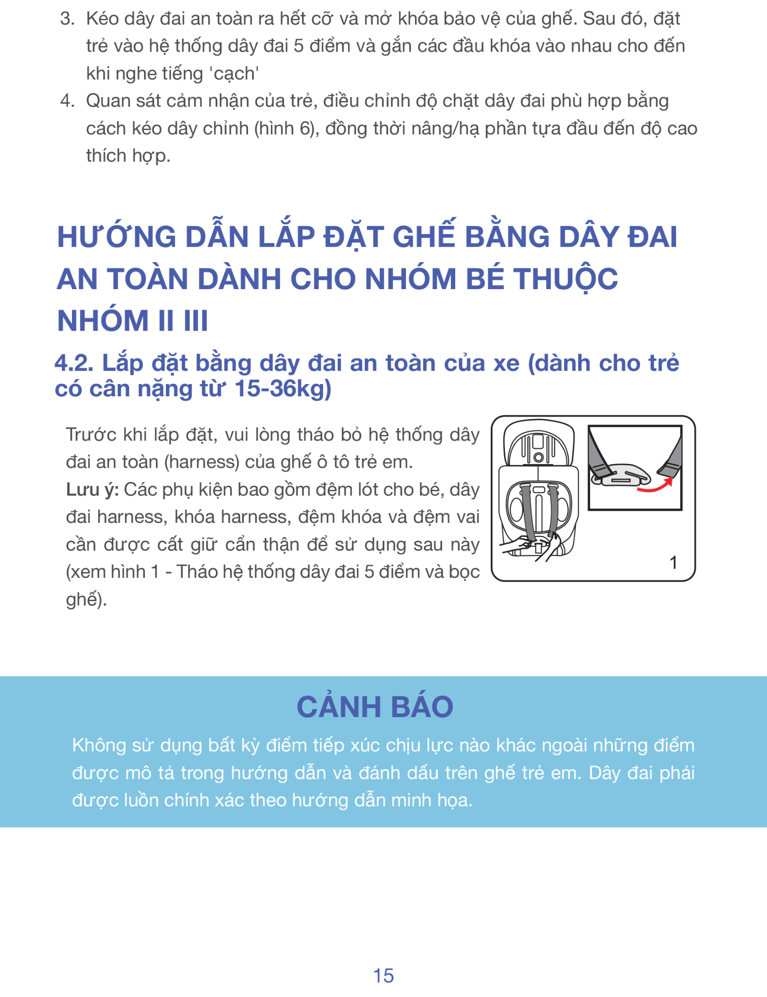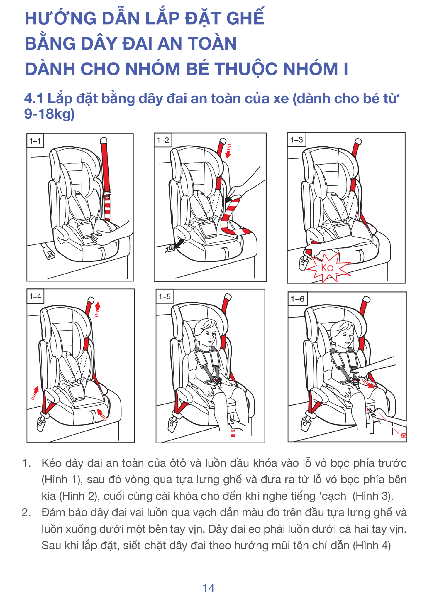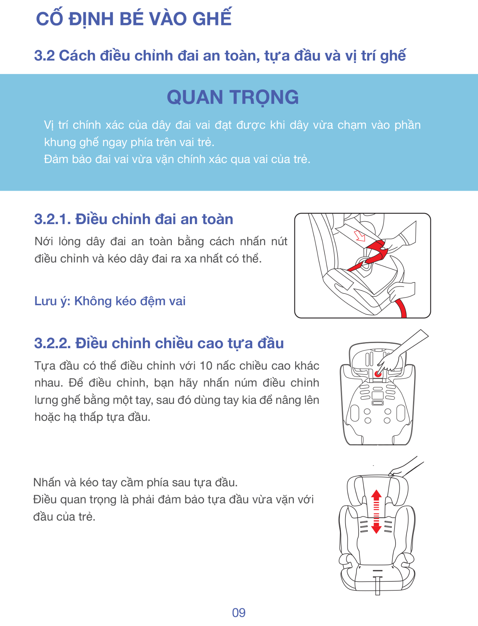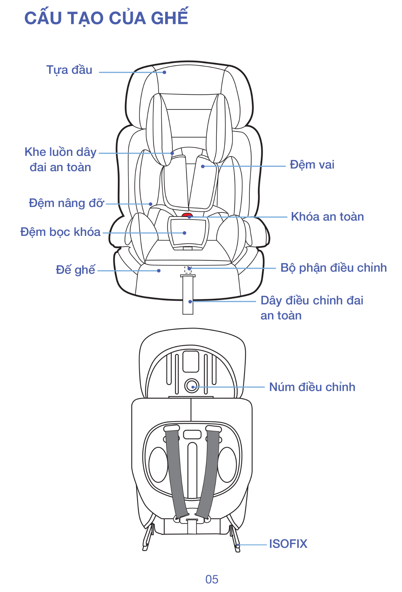 Điều chỉnh: 6 mức độ cao tựa đầu / 4 mức dây đai / tựa lưng ngả theo ghế xe
