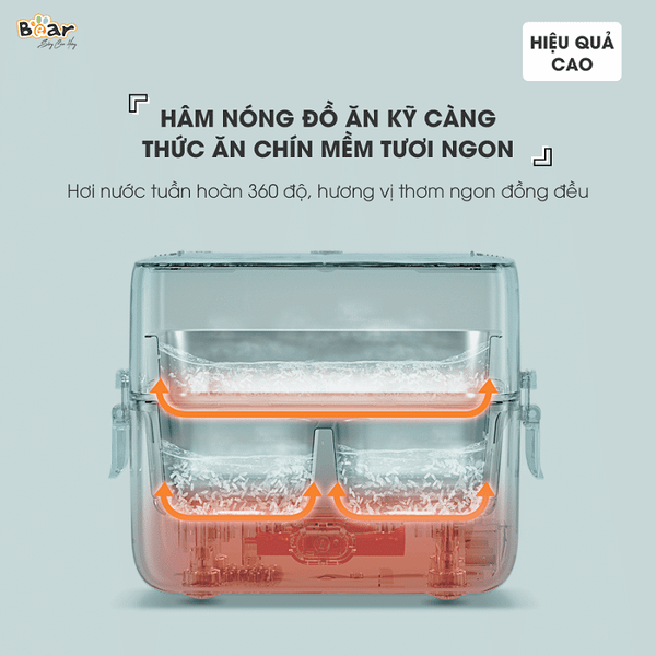 Một trong những điểm nổi bật nhất của hộp cơm điện Bear SB-HC12L chính là khả năng hấp nóng thực phẩm bằng hơi nước tuần hoàn 360 độ. Nhờ công nghệ này, toàn bộ khay thức ăn bên trong sẽ được bao phủ bởi hơi nóng lan tỏa đều từ dưới lên trên, giúp thức ăn nóng đều từ trong ra ngoài mà không bị khô, không mất nước, đặc biệt không làm thay đổi mùi vị hay cấu trúc thực phẩm.