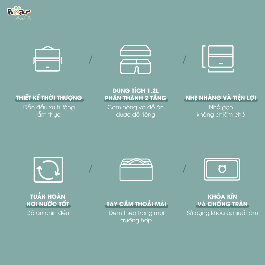 Một trong những điểm mạnh của Bear SB-HC12L chính là hệ thống khóa kín thông minh và nắp chống tràn kép. Dù bạn di chuyển nhiều hay đặt hộp trong balo, vali, thức ăn bên trong vẫn được giữ yên vị, không bị chảy nước ra ngoài. Cơ chế khóa chắc chắn cũng giúp hộp cơm giữ nhiệt và hơi nước tốt hơn, đảm bảo thực phẩm luôn nóng hổi khi sử dụng.