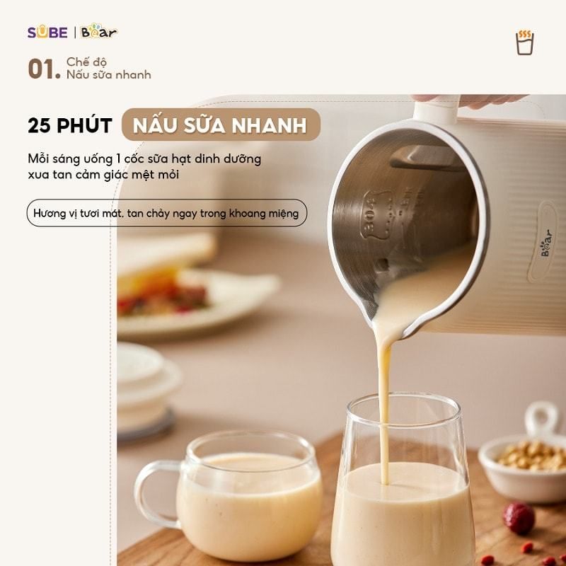 Máy có thể xay nhuyễn và nấu chín các loại hạt như đậu nành, hạnh nhân, óc chó, hạt điều... thành sữa béo mịn mà không cần lọc lại. Bạn có thể chọn chế độ "Nấu sữa" hoặc "Nấu sữa nhanh" tùy vào thời gian và loại nguyên liệu.