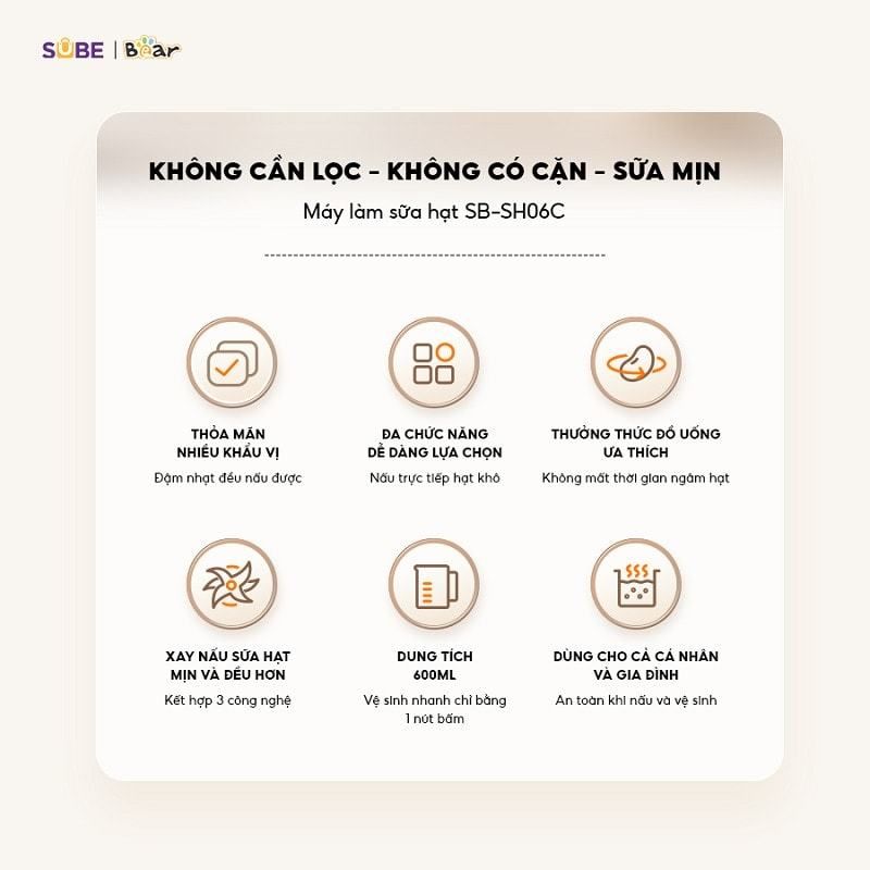 Máy làm sữa hạt Bear SB-SH06C là lựa chọn lý tưởng cho những ai yêu thích lối sống lành mạnh và mong muốn tự tay chế biến sữa hạt tại nhà. Với thiết kế nhỏ gọn, dung tích 600ml cùng bảng điều khiển cảm ứng thông minh, thiết bị này không chỉ giúp bạn tạo ra những ly sữa thơm ngon, bổ dưỡng mà còn phù hợp cho cả sinh tố, cháo dinh dưỡng hay súp nóng. Bear SB-SH06C là giải pháp tiện lợi, hiện đại, đáp ứng hoàn hảo nhu cầu sử dụng cá nhân và gia đình nhỏ.