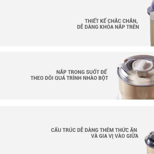Máy được làm từ hợp kim nhôm phủ lớp chống dính cao cấp, vừa bền bỉ vừa dễ vệ sinh. Nắp cối trong suốt không chỉ tạo điểm nhấn thẩm mỹ mà còn cho phép bạn quan sát quá trình nhào bột mà không cần mở nắp. Từng chi tiết được thiết kế tỉ mỉ, mang đến sự tiện lợi và an toàn tối đa cho người sử dụng.