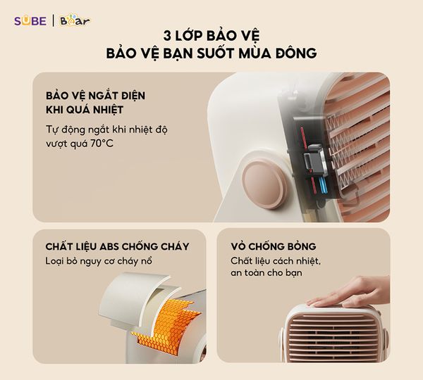 Máy sưởi Bear DNQ-E04Q1 được thiết kế với hệ thống bảo vệ 3 lớp an toàn, giúp người dùng hoàn toàn yên tâm khi sử dụng, đặc biệt là trong gia đình có trẻ nhỏ và người lớn tuổi.