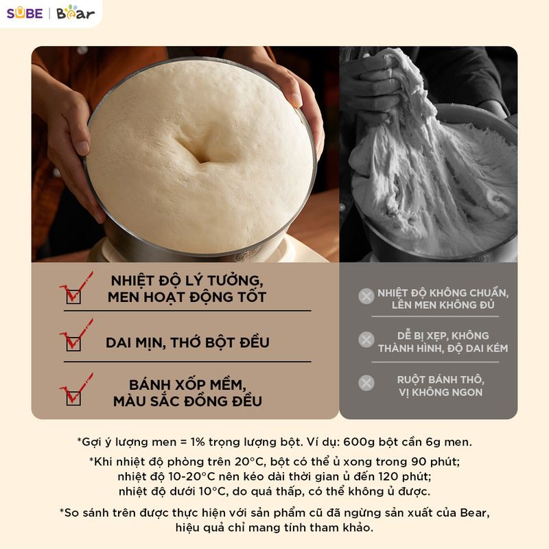 Máy duy trì nhiệt độ ủ 28 - 35°C, môi trường lý tưởng để men hoạt động, tạo ra các túi khí giúp bột nở gấp đôi. Thớ bột sau khi nướng bông xốp, mềm mại, thơm ngon, không phụ thuộc vào thời tiết bên ngoài.