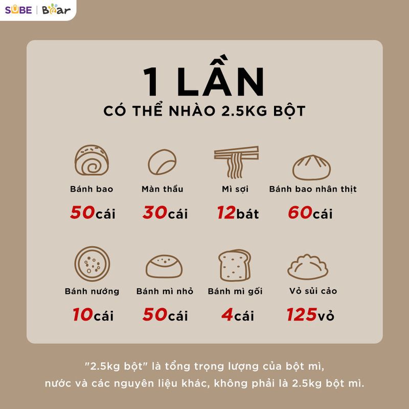 Cối trộn 5L có thể xử lý 0.4 - 1.6kg bột khô, tương đương 2.5kg bột thành phẩm (bao gồm nước và nguyên liệu khác). Máy đáp ứng nhu cầu đa dạng, từ bữa sáng gia đình 4 - 6 người đến tiệc cuối tuần: