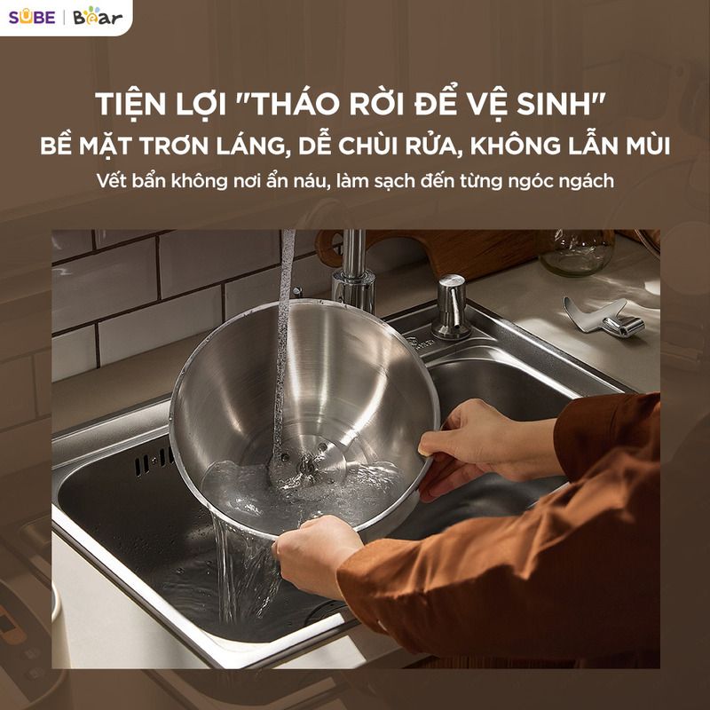 Cối trộn và dao trộn làm từ thép không gỉ 304, chống ăn mòn, không phản ứng với thực phẩm, đảm bảo an toàn sức khỏe. Bề mặt láng mịn, chống bám dính, tháo rời dễ dàng, giúp vệ sinh nhanh chóng sau mỗi lần sử dụng.