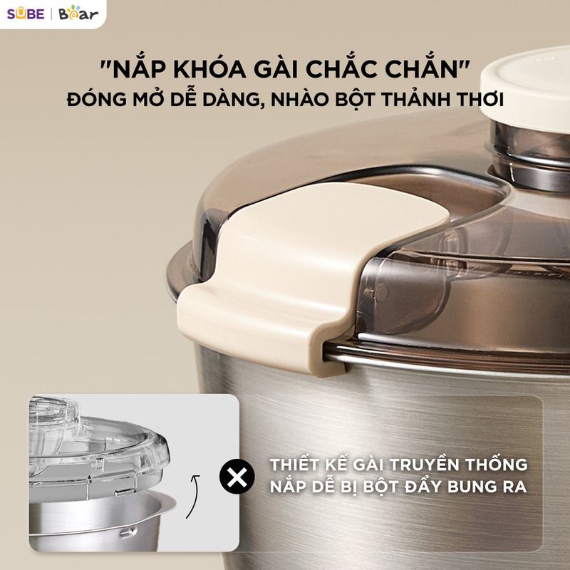 Nắp trong suốt, khóa gài an toàn: Quan sát dễ dàng, ngăn bột văng và đảm bảo an toàn khi hoạt động.