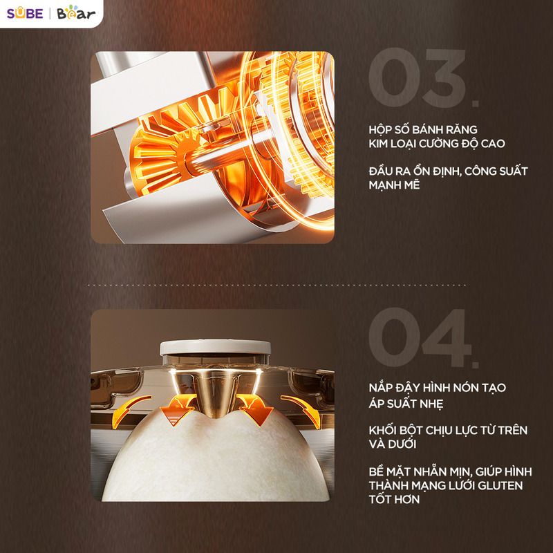 Động cơ DC mô-men xoắn lớn kết hợp hộp số bánh răng kim loại mang lại lực nhào mạnh mẽ, xử lý dễ dàng bột bánh mì đặc quánh hay bột bánh ngọt mềm. Hộp số kim loại đảm bảo độ bền vượt trội, giúp máy vận hành ổn định và có tuổi thọ cao.