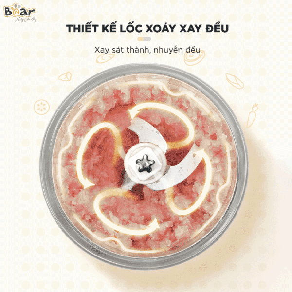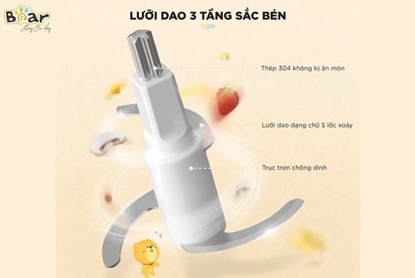 Bear GR-B06V1 nổi bật với công suất mạnh mẽ 200W kết hợp lưỡi dao chữ S ba tầng sắc bén, giúp xay nhuyễn nhanh chóng rau củ, thịt, cá hay thậm chí cả hạt mềm để làm bột ăn dặm cho bé.