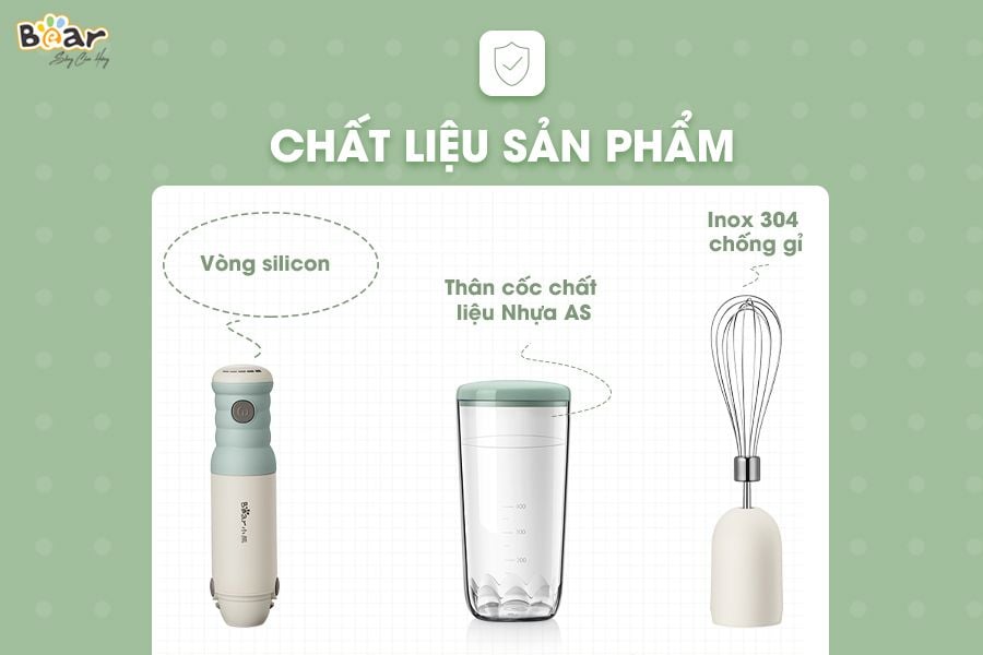 Bear JBQ-V50E1 có khóa an toàn, chỉ hoạt động khi lắp đúng khớp. Cốc xay làm từ nhựa ABS và inox 304 chống gỉ, đảm bảo an toàn thực phẩm. Chất liệu chịu nhiệt và không bám mùi, giúp sử dụng lâu dài mà vẫn giữ tính thẩm mỹ và độ bền.