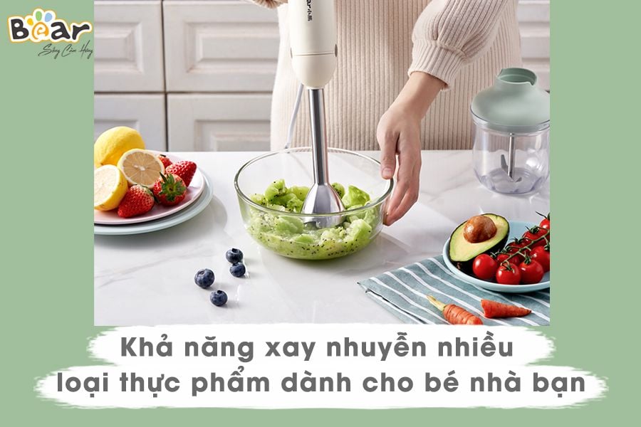 Máy có thể xay đa dạng thực phẩm như thịt, rau củ, trái cây, gia vị, đồng thời đáp ứng tốt nhu cầu nấu ăn dặm cho bé nhờ khả năng xay mịn, không lợn cợn. Với dung tích vừa đủ và tốc độ dễ điều chỉnh, thiết bị hỗ trợ người dùng nấu ăn nhanh mà vẫn giữ được chất lượng món ăn.