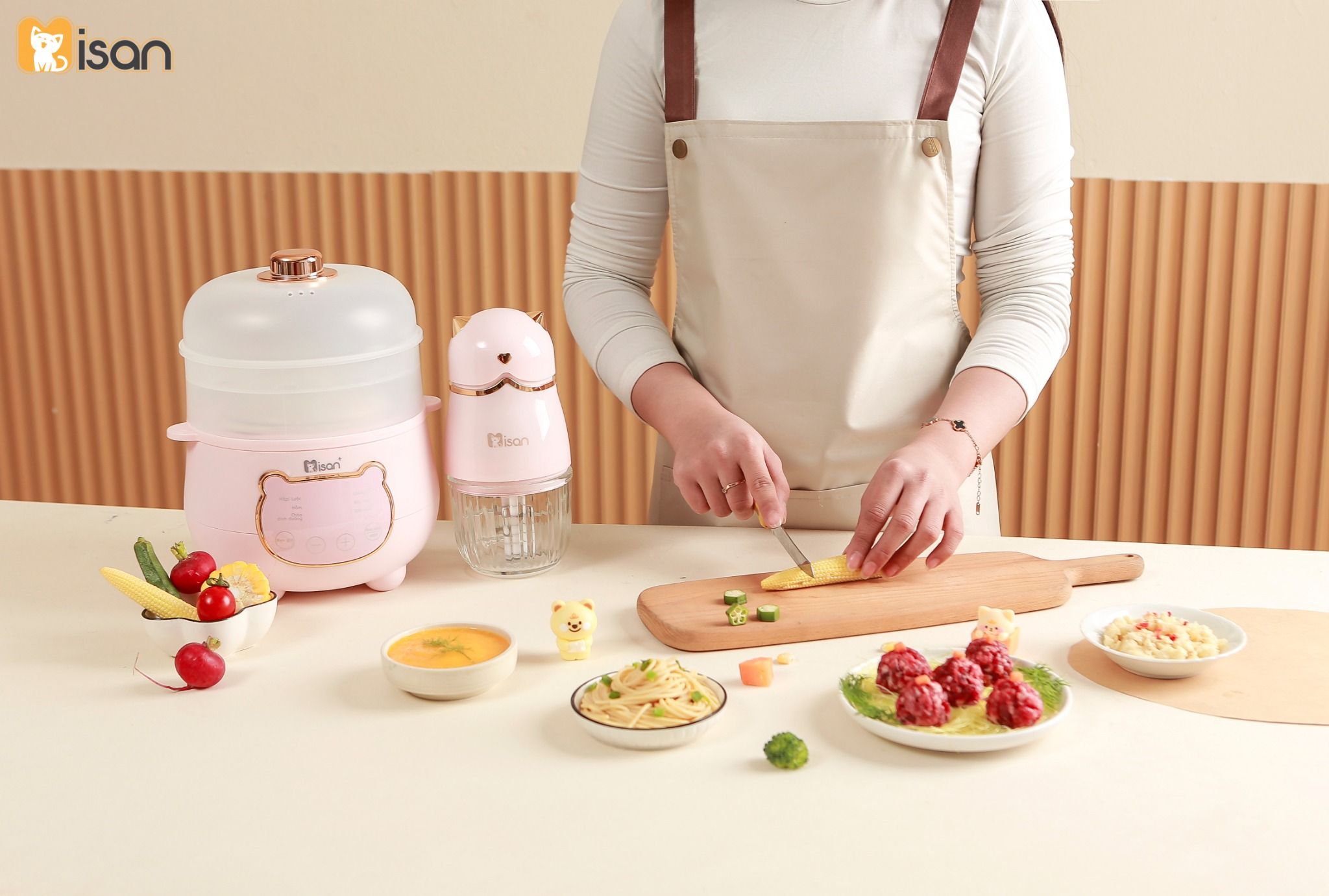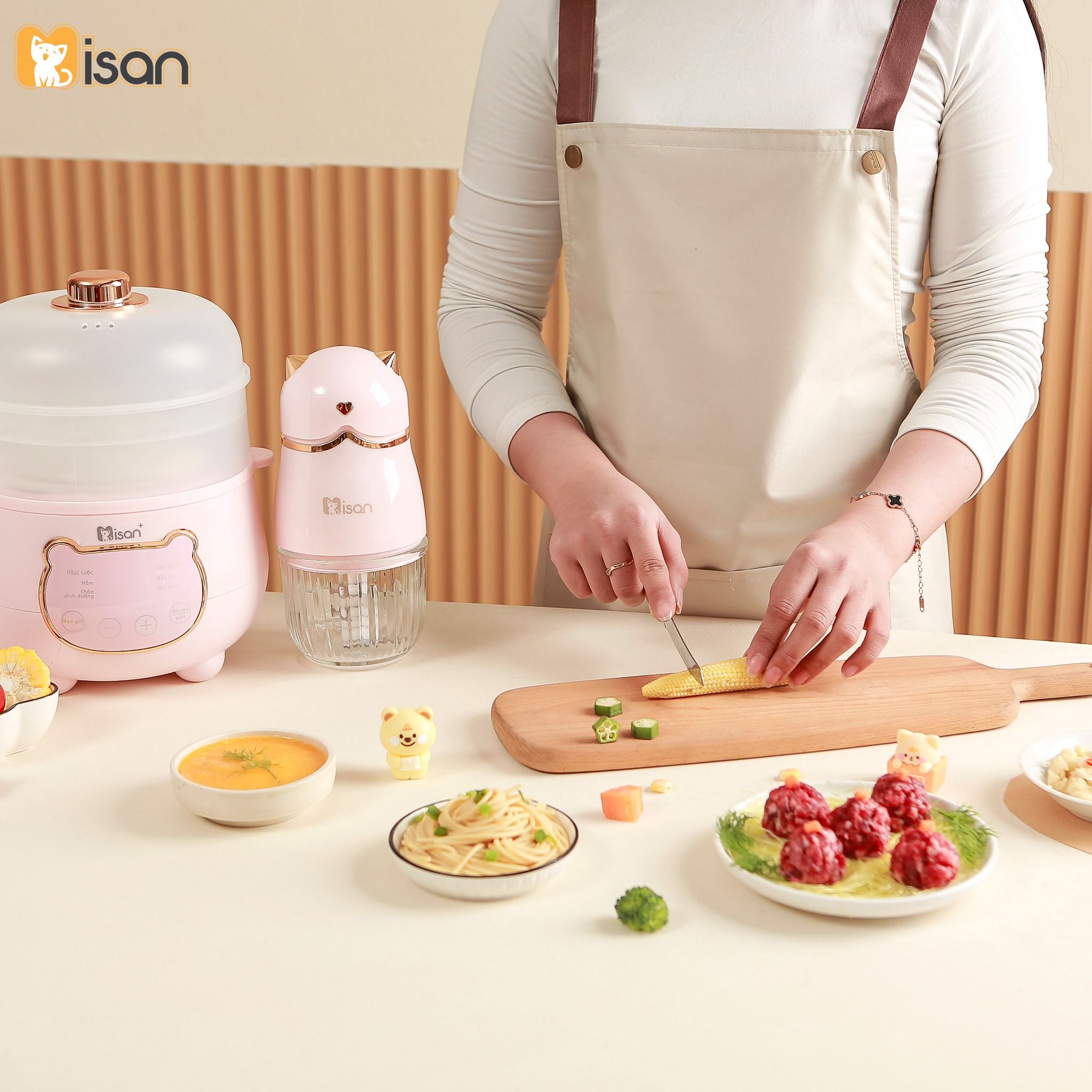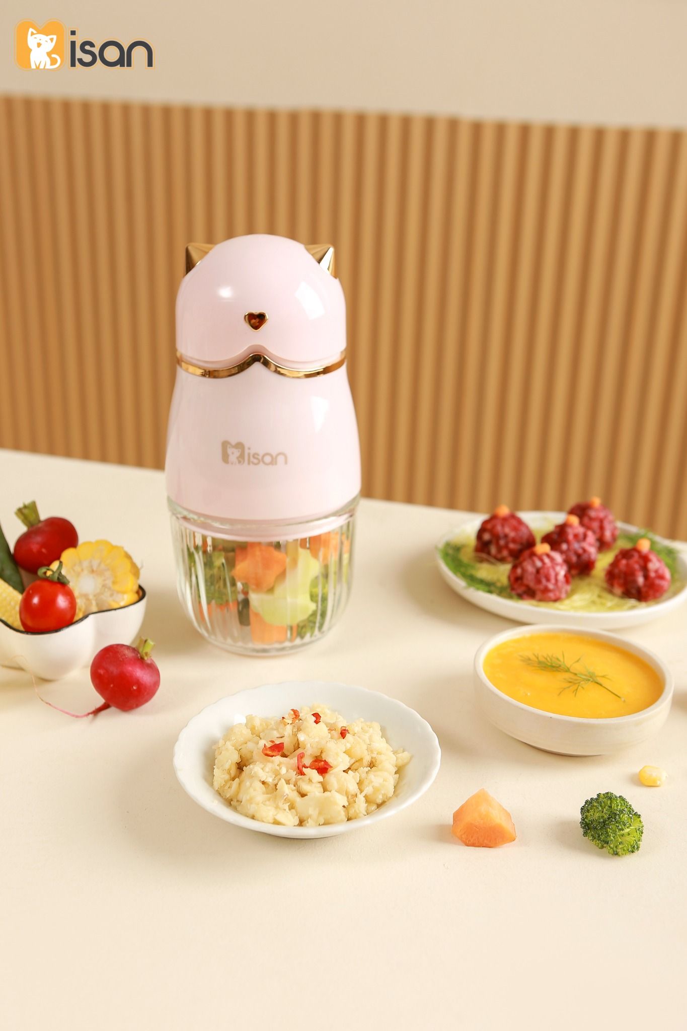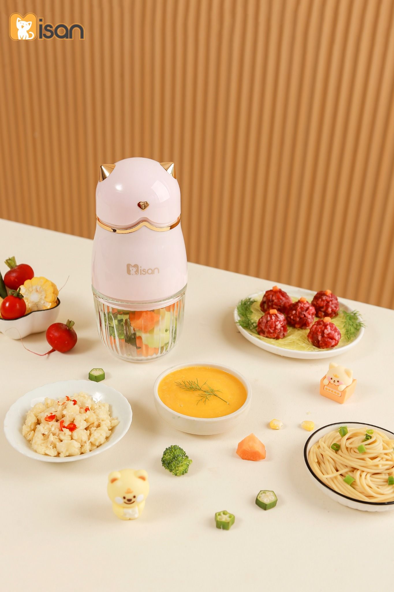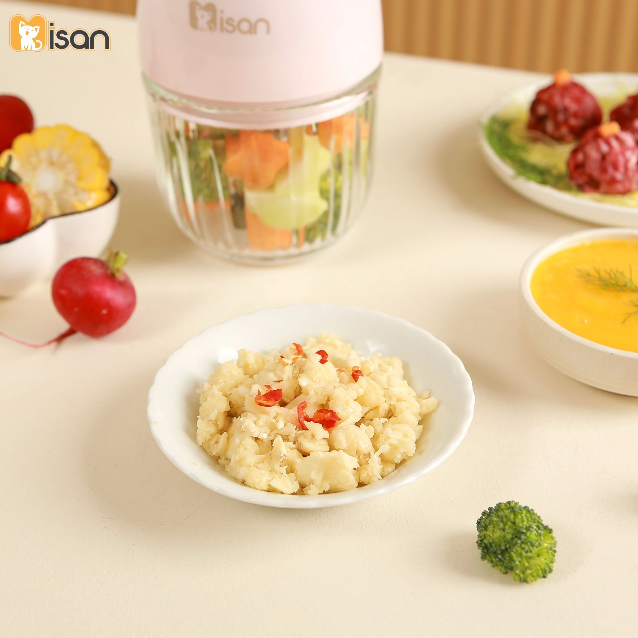 - Xay cháo ăn dặm, súp mịn cho bé: Máy xay Misan 8 lưỡi là trợ thủ đắc lực giúp mẹ chuẩn bị các món ăn dặm mềm mịn cho bé từ 6 tháng tuổi. Nhờ khả năng xay nhuyễn siêu nhanh, máy giúp biến thịt, cá, rau củ thành hỗn hợp mịn, dễ tiêu hóa, giữ trọn dinh dưỡng mà bé vẫn dễ ăn và hấp thu.