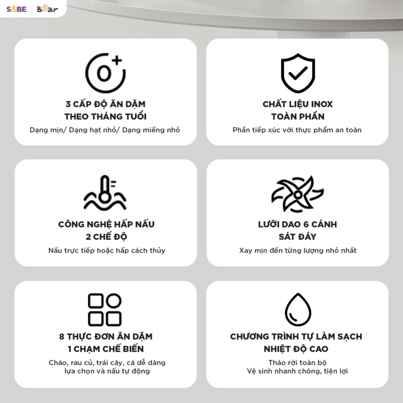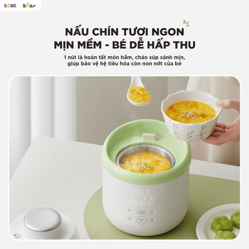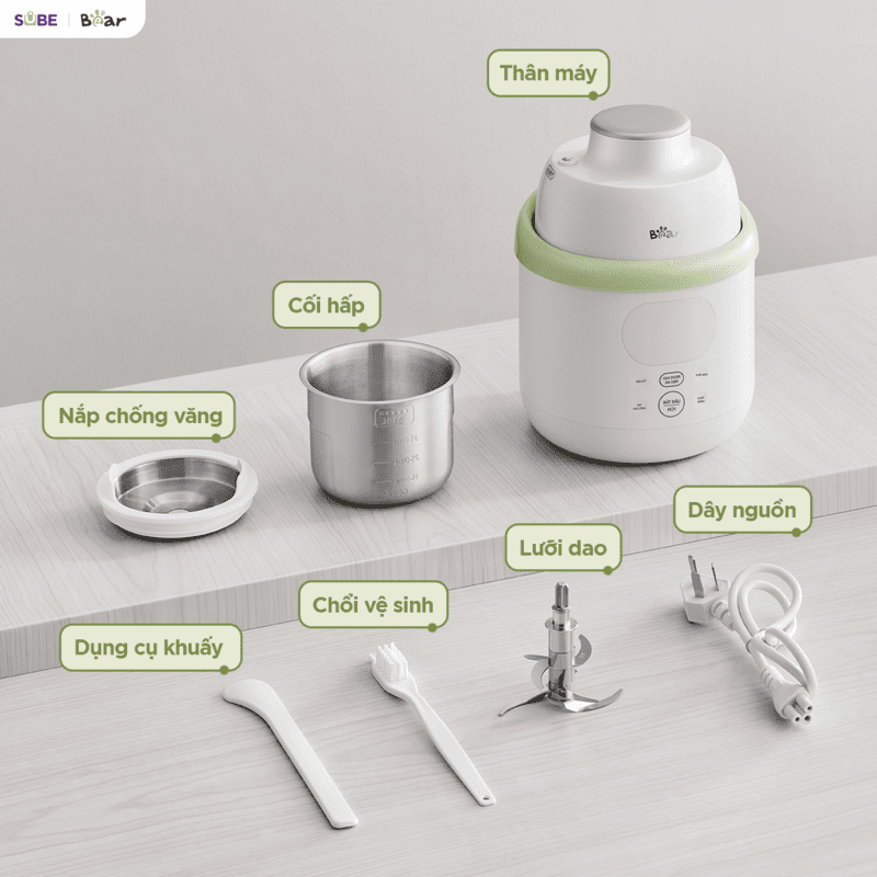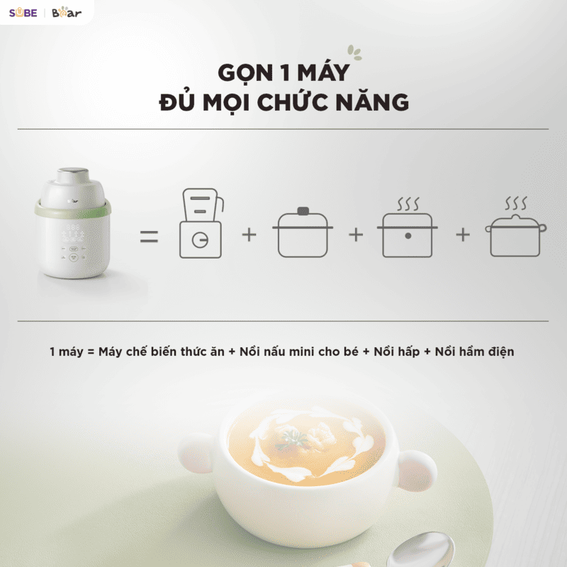 | Chức năng | Chọn các chế độ: Cháo bột - Thịt - Rau củ - Trái cây - Củ quả - Cá - Hầm - Vệ sinh |