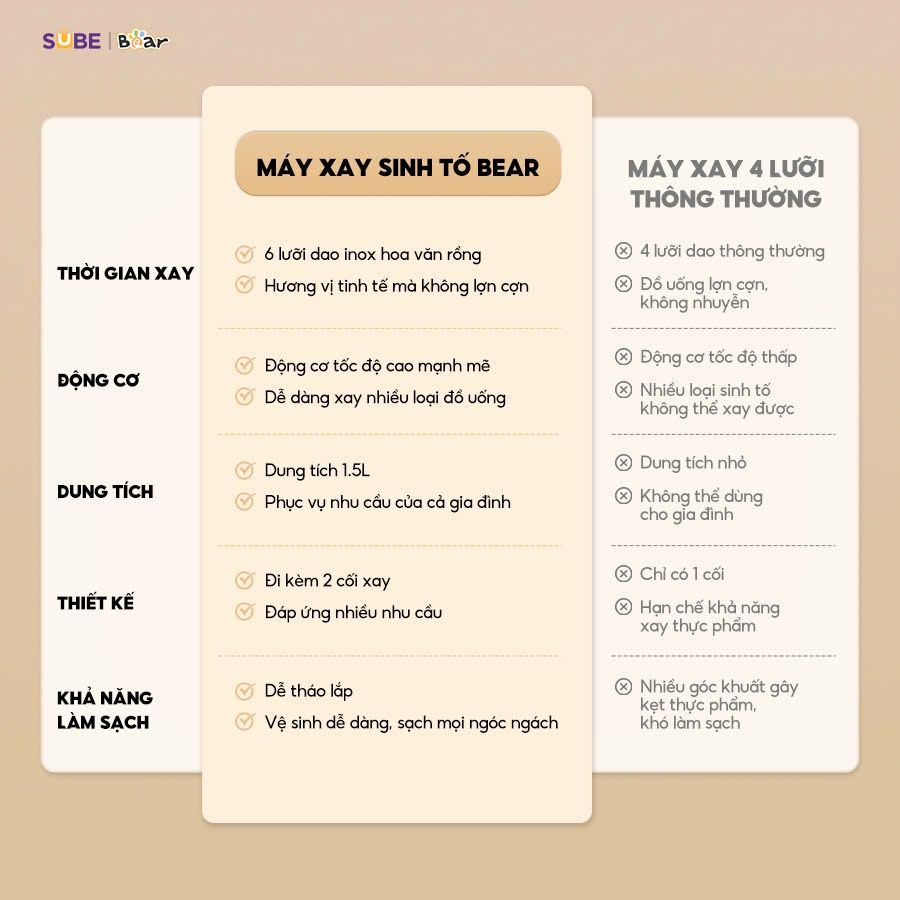 Không chỉ nổi bật bởi khả năng xay đa dạng, Bear SB-MX15L còn ghi điểm với thiết kế an toàn, dễ vệ sinh và bảng điều khiển tiện lợi, mang đến trải nghiệm sử dụng mượt mà cho cả người bận rộn lẫn nội trợ gia đình.