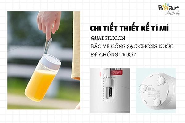 Ngoài ra, máy còn tích hợp quai silicon tiện lợi và đế chống trượt chắc chắn, giúp người dùng cầm nắm chắc tay và xay sinh tố an toàn trong mọi tình huống.