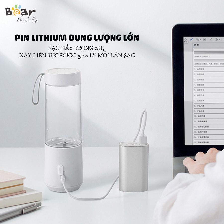 Máy được tích hợp pin lithium dung lượng cao, cho phép bạn xay từ 5 - 10 ly sinh tố sau mỗi lần sạc đầy. Chỉ mất khoảng 2 giờ để sạc đầy, người dùng có thể thoải mái mang theo cả ngày mà không lo hết pin, kể cả trong những chuyến đi dài hay hoạt động ngoài trời.