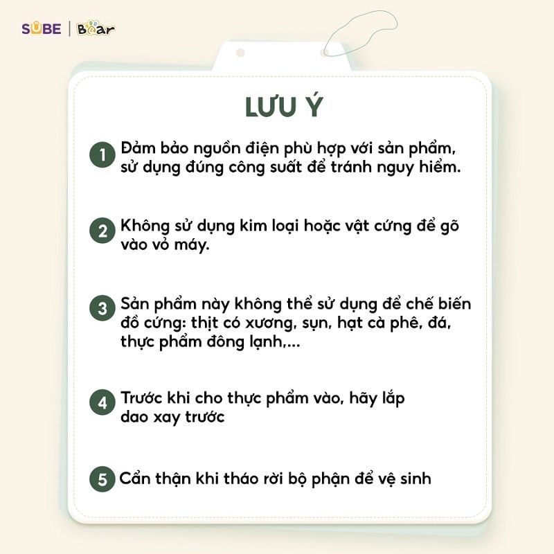 Trục dao ngắn hạn chế kẹt thực phẩm, giúp xay nhuyễn nhanh và dễ vệ sinh hơn. Lưỡi dao có thể tháo rời hoàn toàn, thuận tiện làm sạch kỹ lưỡng, tránh bám mùi hay tích tụ vi khuẩn. Bear CH-4H03F mang lại sự an tâm, tiện lợi và tiết kiệm thời gian cho những ai thường xuyên chế biến món ăn tại nhà.