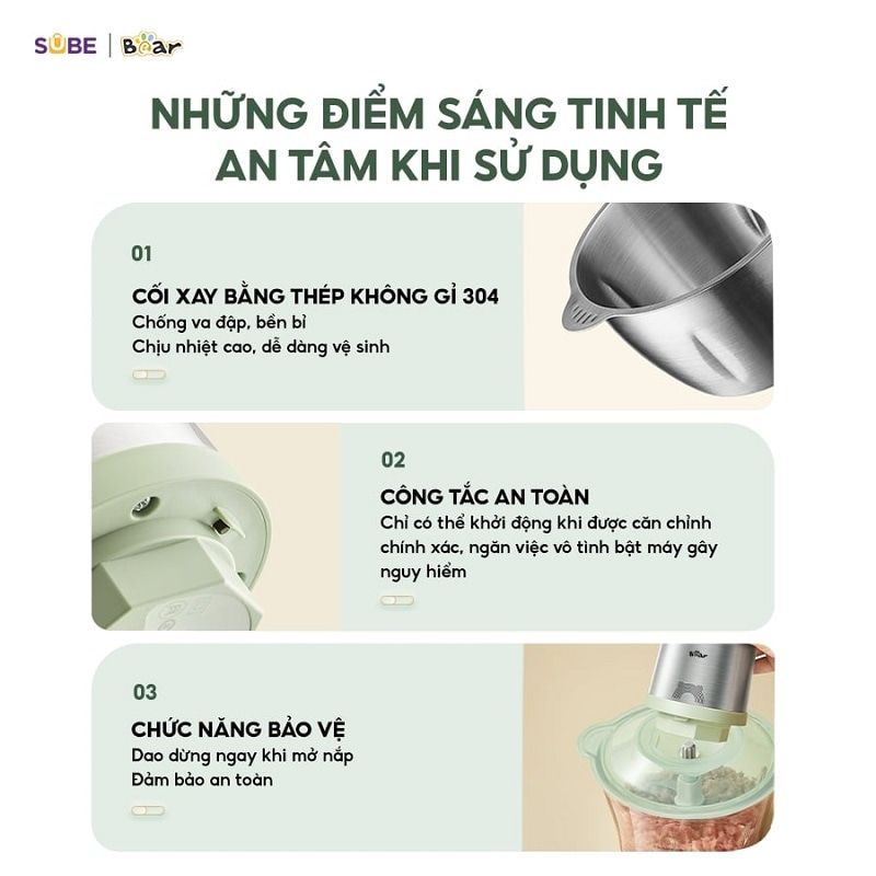 Máy xay thịt Bear CH-4H03F được thiết kế chú trọng an toàn và trải nghiệm sử dụng. Máy chỉ hoạt động khi các bộ phận được lắp đúng khớp, tránh khởi động ngoài ý muốn - đặc biệt an toàn cho gia đình có trẻ nhỏ. Khi mở nắp, lưỡi dao lập tức ngừng quay, giúp thao tác vệ sinh hoặc thêm nguyên liệu trở nên an toàn tuyệt đối.