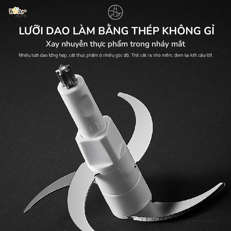 Máy xay thịt Bear SB-MA02L trang bị lưỡi dao kép 4 cánh làm từ thép không gỉ cao cấp, đảm bảo độ sắc bén lâu dài và khả năng xay thực phẩm mịn đều. Lưỡi dao có thể tháo rời dễ dàng, giúp vệ sinh nhanh chóng và hạn chế tình trạng tích tụ cặn thực phẩm sau nhiều lần sử dụng.