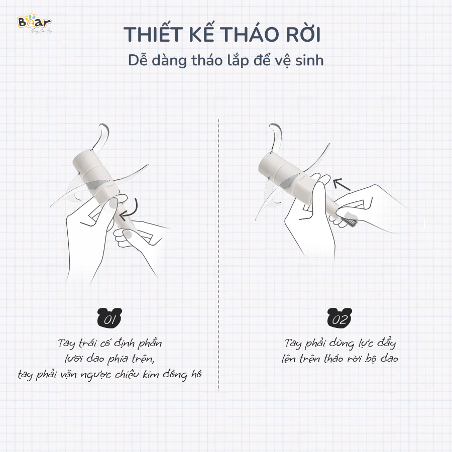 - Máy xay thịt Bear SB-MA02L có thiết kế dễ tháo lắp, giúp người dùng vệ sinh sạch sẽ chỉ trong vài phút.