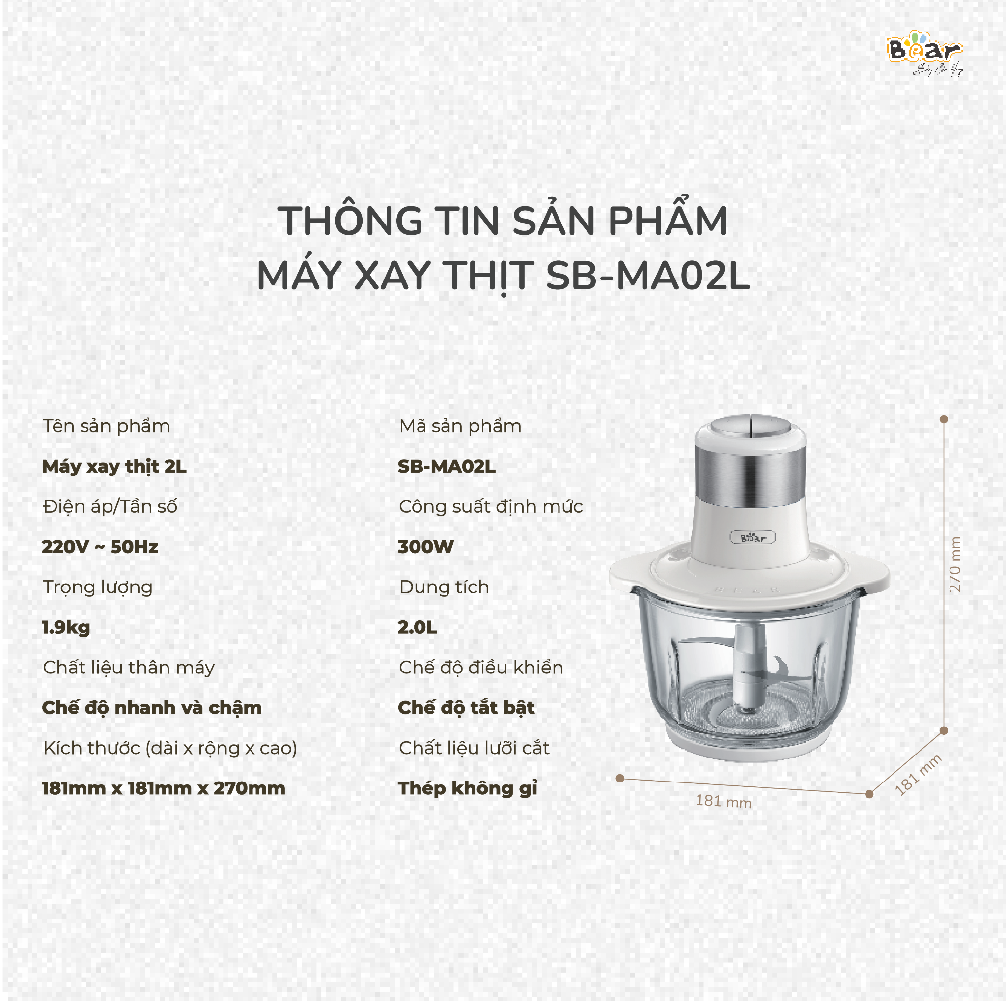 Thông Số Kỹ Thuật Máy Xay Thịt Bear 2L SB-MA02L