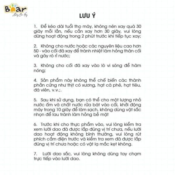 1. Không vận hành liên tục quá lâu: Mỗi lần xay không nên vượt quá 30 giây. Nếu cần xay tiếp, để máy nghỉ ít nhất 2 phút trước khi sử dụng lại.
