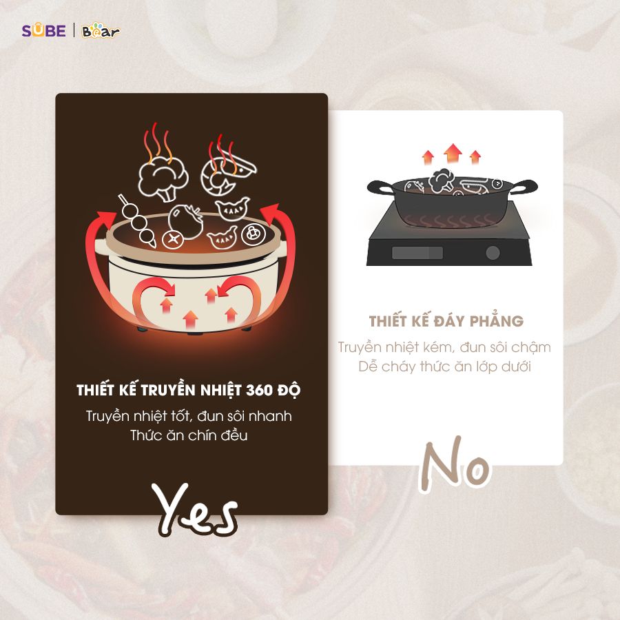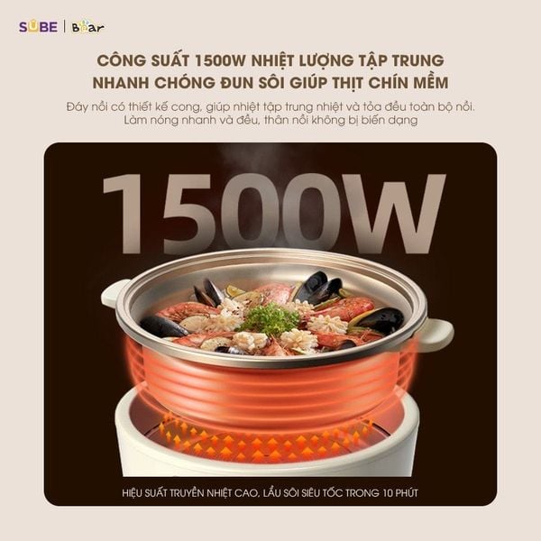 Nồi lẩu Bear SB-NL05F được trang bị công suất 1500W, cho khả năng làm nóng nhanh chỉ trong 10 phút. Mâm nhiệt lớn đường kính 180mm cùng công nghệ truyền nhiệt 360 độ giúp thực phẩm chín đều, giữ trọn hương vị, tránh tình trạng cháy cạnh hay sống bên trong. Đáy nồi cong nhẹ giúp duy trì nhiệt ổn định suốt quá trình nấu.