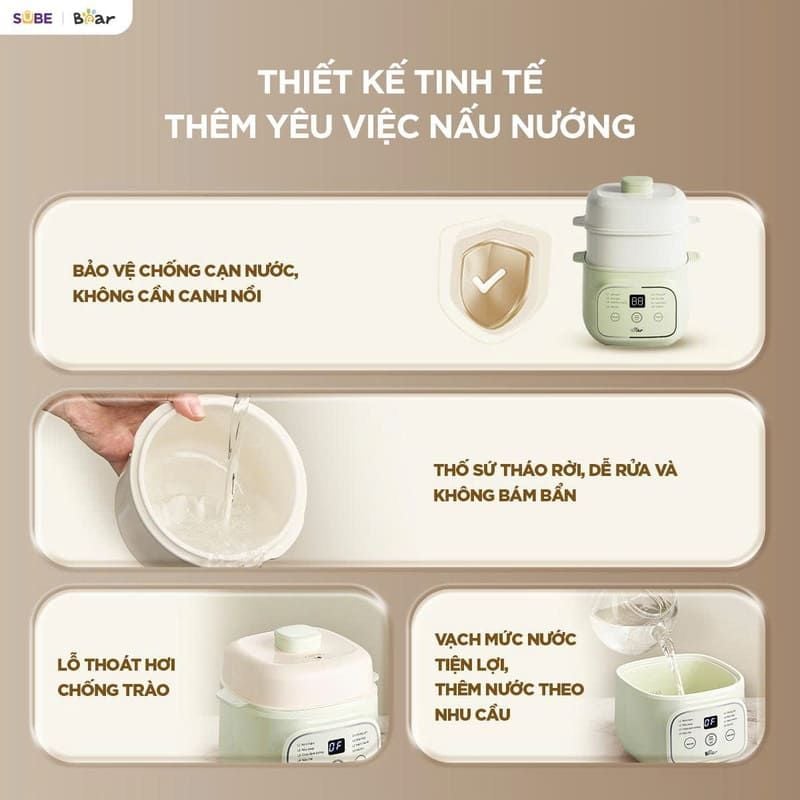 Phần ngoại hình cũng được thiết kế gọn gàng, phù hợp với bếp chung cư hoặc bàn bếp nhỏ. Tông màu trung tính dễ phối với các thiết bị khác như máy hâm sữa, máy tiệt trùng hay nồi cháo. Nhờ kích thước vừa phải, nồi có thể đặt cố định trên bàn mà không chiếm diện tích, thậm chí nấu xuyên đêm mà không gây ồn hay khó chịu.