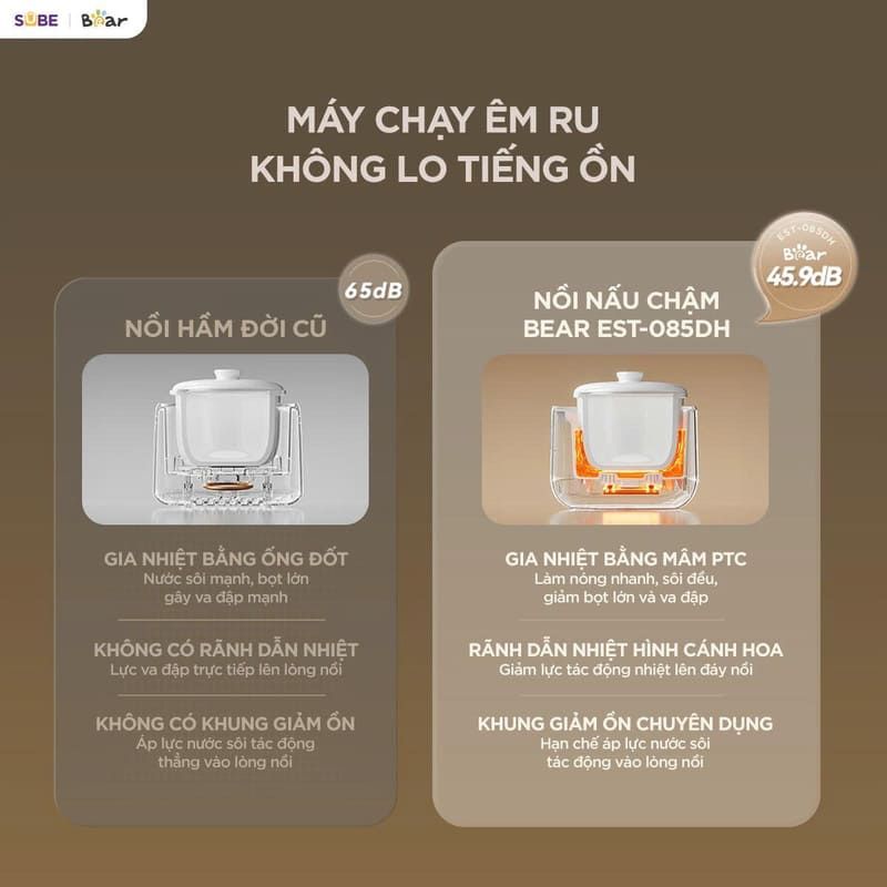 Nếu các dòng nồi hầm đời cũ thường phát ra tiếng "ùng ục" khi nước bắt đầu sôi - dễ khiến bé giật mình hoặc làm ảnh hưởng đến giấc ngủ buổi tối - thì Bear EST-085DH đã xử lý triệt để nhược điểm này.