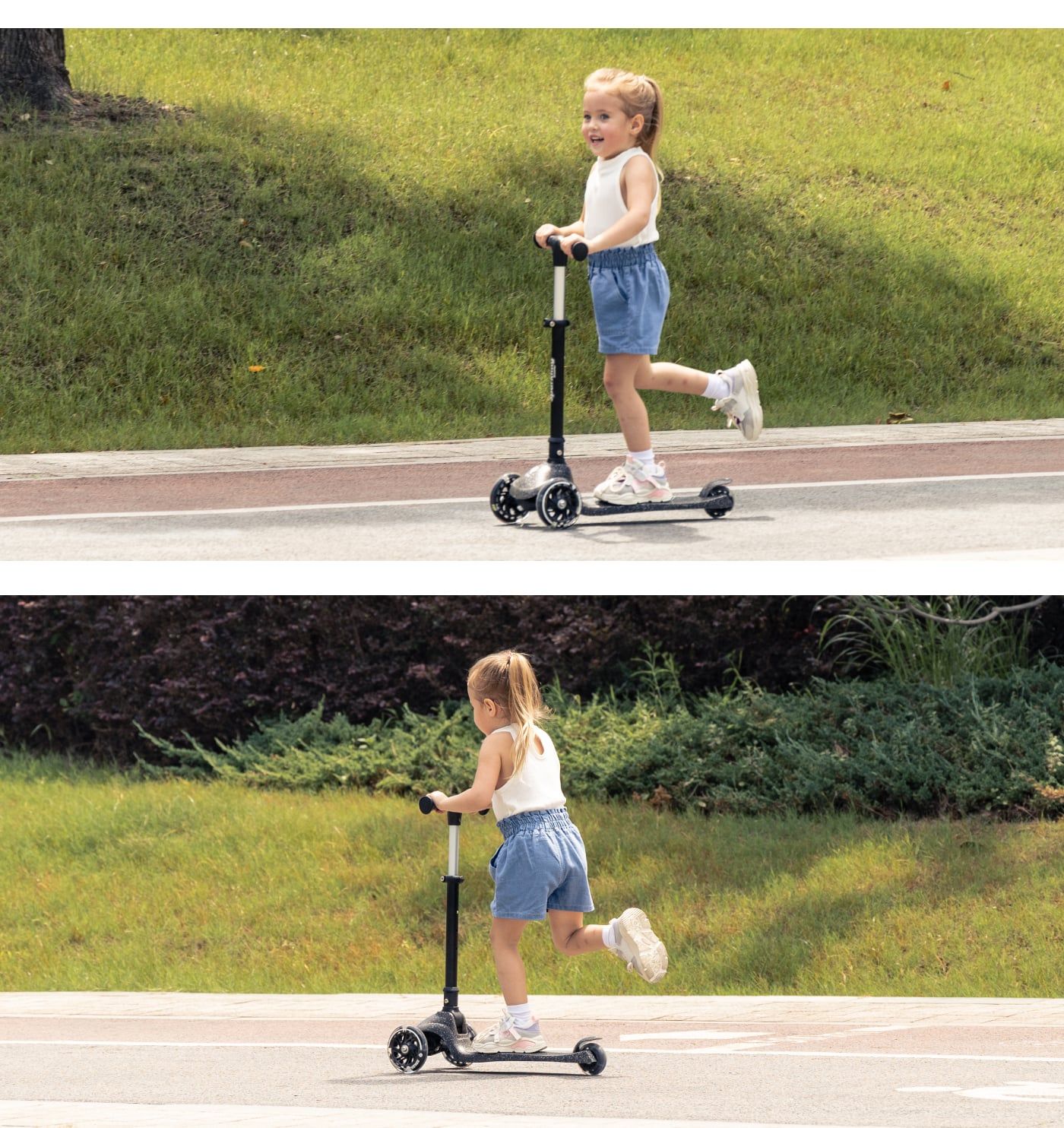 Với trọng lượng chỉ 2.7kg, bé hoàn toàn có thể tự đẩy hoặc nhấc scooter khi lên xuống bậc thang hoặc thay đổi vị trí chơi. Cơ chế gập đơn giản chỉ bằng một thao tác, phù hợp khi: