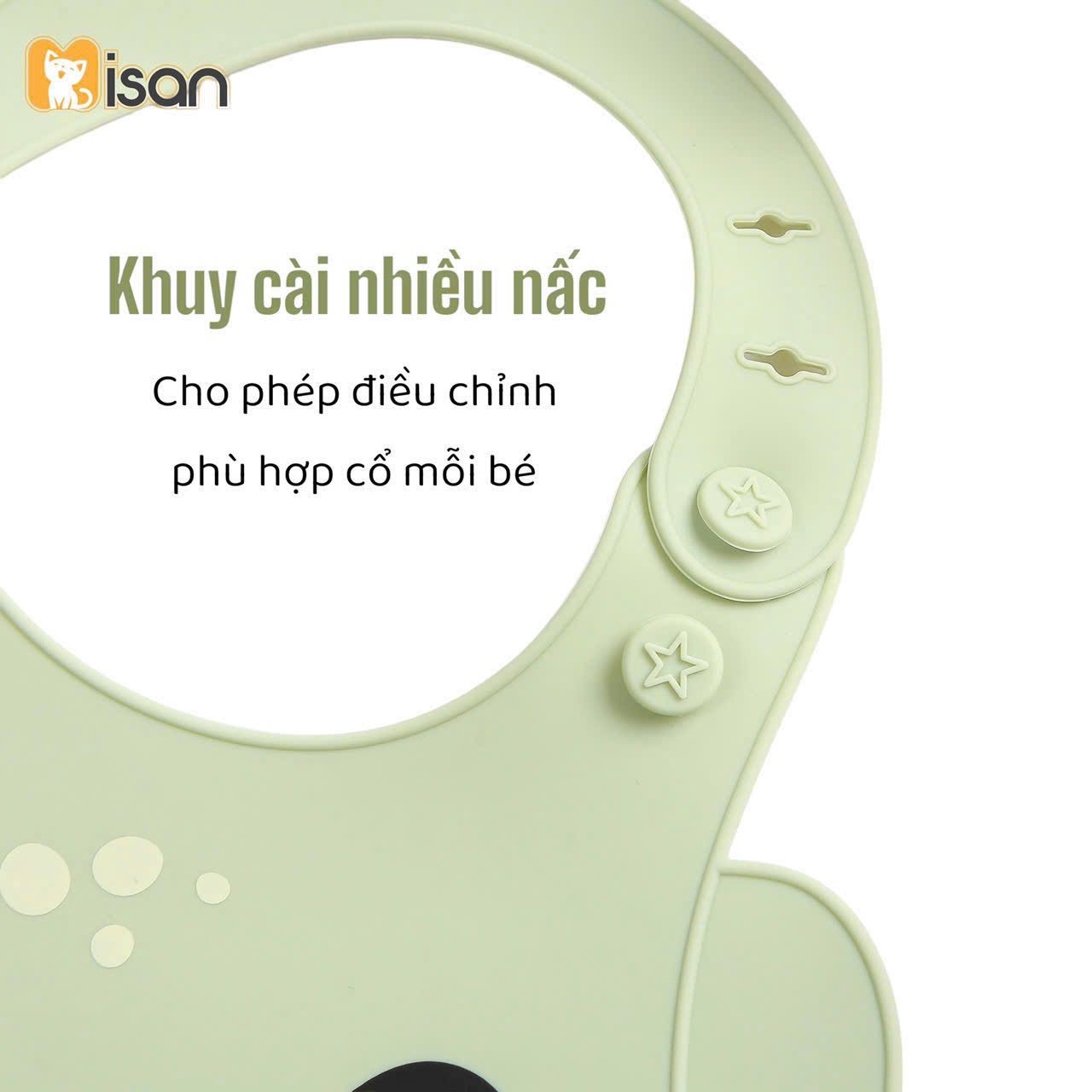 Yếm silicon hình thú có tai Misan được trang bị nut cài chắc chắn với nhiều nấc điều chỉnh linh hoạt, giúp mẹ dễ dàng tùy chỉnh kích cỡ phù hợp với độ tuổi và vóc dáng của bé. Thiết kế này đảm bảo yếm ôm vừa vặn quanh cổ mà không gây khó chịu, đồng thời không bị tuột ra khi bé cử động mạnh hoặc kéo giật.