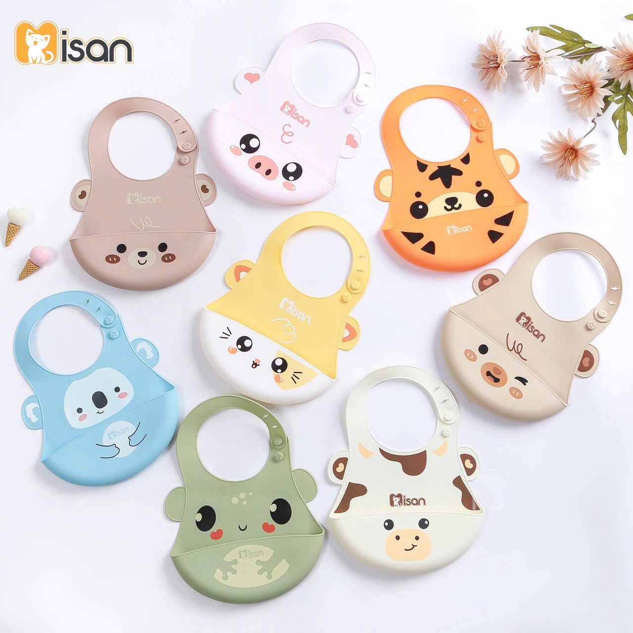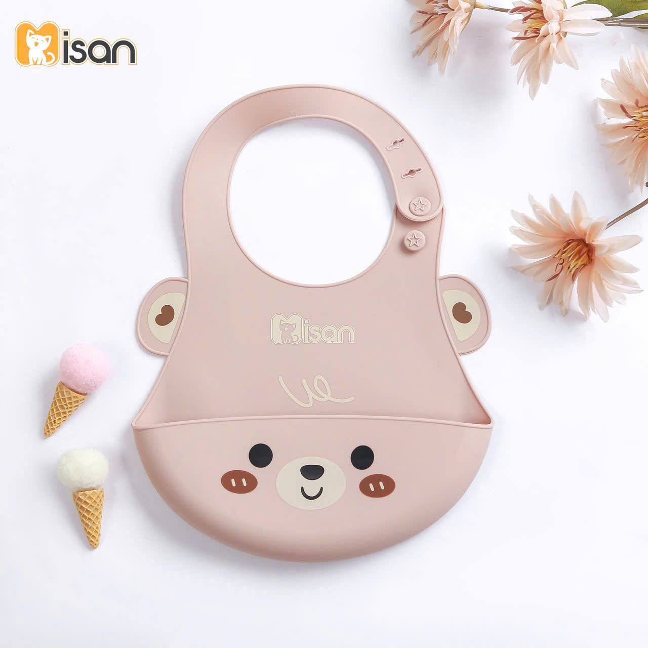 Yếm silicon hình thú có tai Misan nổi bật với thiết kế sinh động và dễ thương, lấy cảm hứng từ các loài động vật thân thiện như gấu, thỏ, mèo, gà con... kết hợp với đôi tai nổi 3D độc đáo. Hình ảnh đáng yêu này không chỉ thu hút ánh nhìn mà còn tạo sự thích thú, kích thích sự tò mò và tập trung của bé trong mỗi bữa ăn.